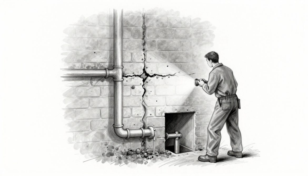 Suchen Sie Risse in Wänden und Böden. Nehmen Sie eine Taschenlampe. Gehen Sie systematisch vor. Fangen Sie unten an. Folgen Sie Linien nach oben. Messen Sie Rissbreite mit einem Lineal. Über 2 Millimeter breit? Wasser dringt ein. Drücken Sie mit dem Finger drauf. Bleibt es feucht? Notieren Sie Positionen.