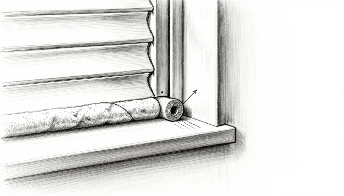 Hand-drawn graphite sketch depicting careful application of low-expansion PU foam into gaps of an insulated roller shutter box using a foam gun, with window frame nearby and relaxed hands.